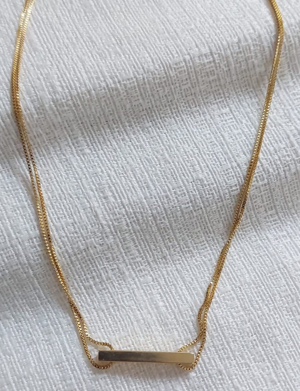 Descrição: Corrente dupla banhada a ouro, 45cm, com pingente no formato de paralelepípedo liso.