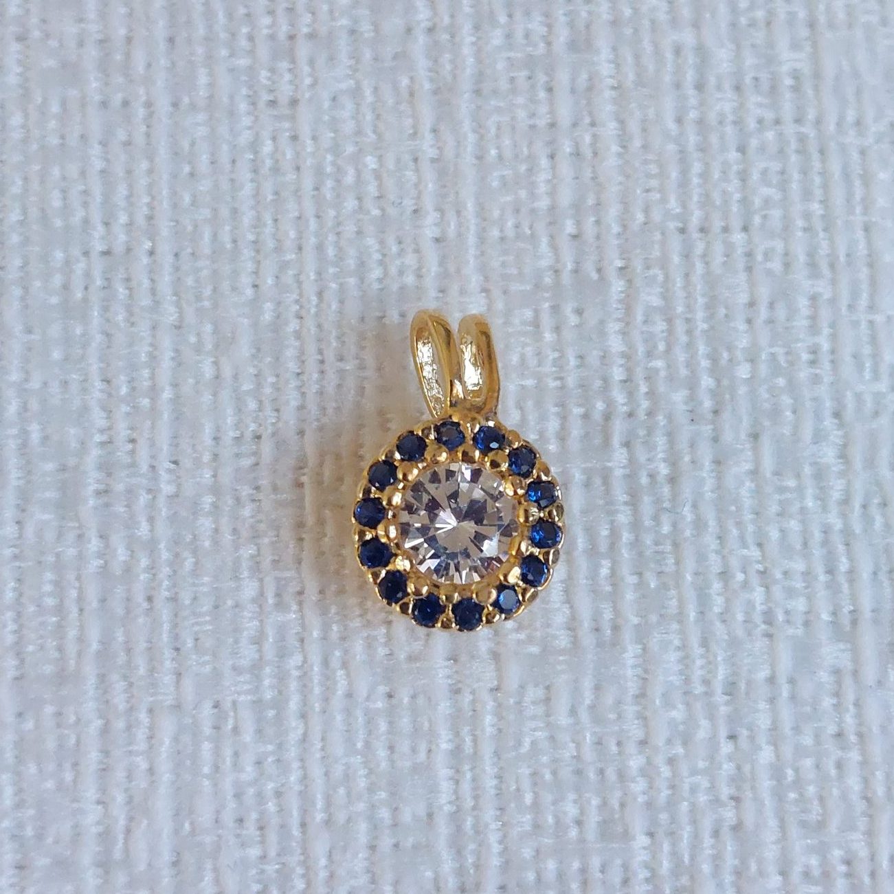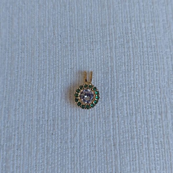 Descrição: Pingente cravejado com pedras coloridas e com detalhe em ponto de luz.