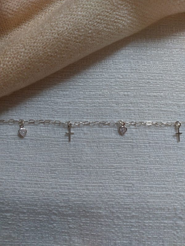 Descrição: Pulseira prata 925 com pingente coração ponto de luz e pingente em formato de cruz.