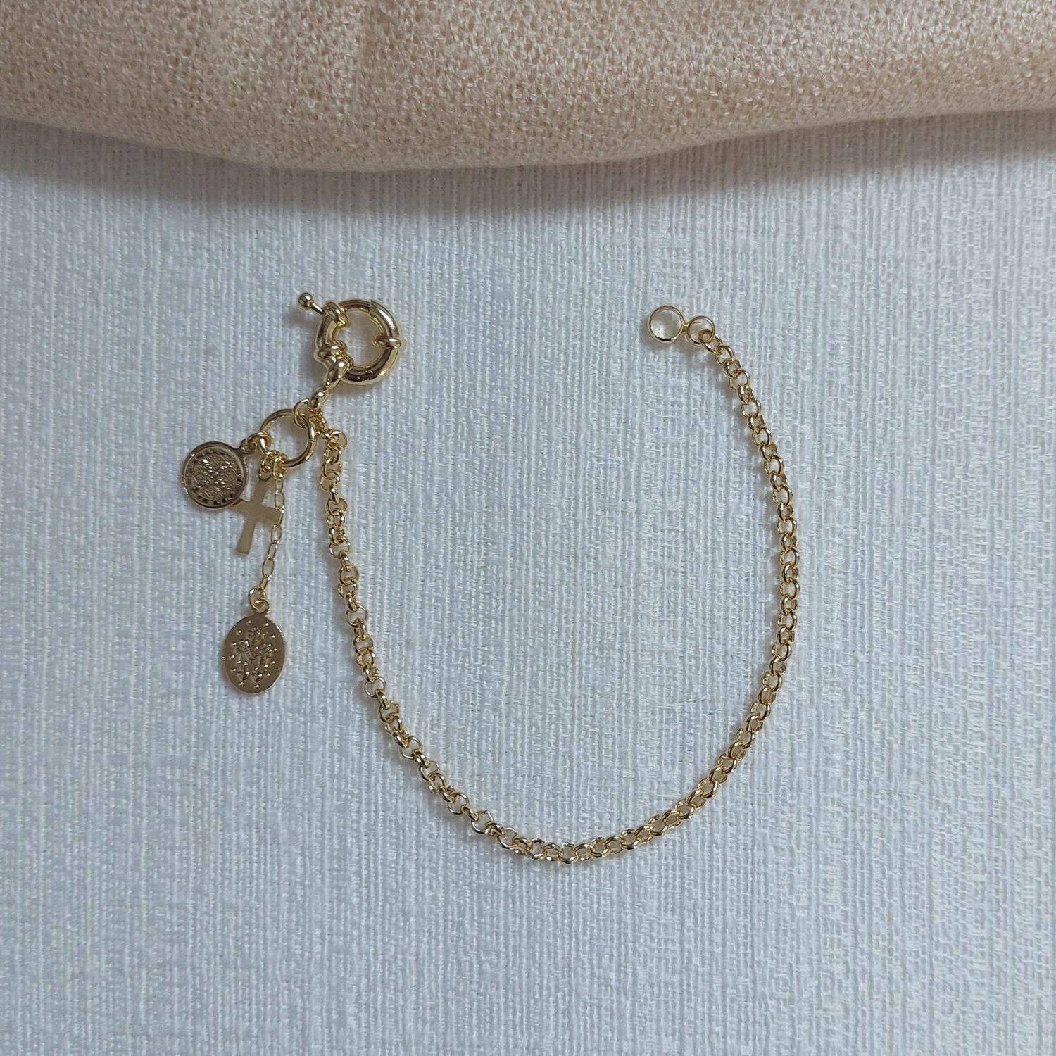 Descrição: pulseira com pingente de medalhas.