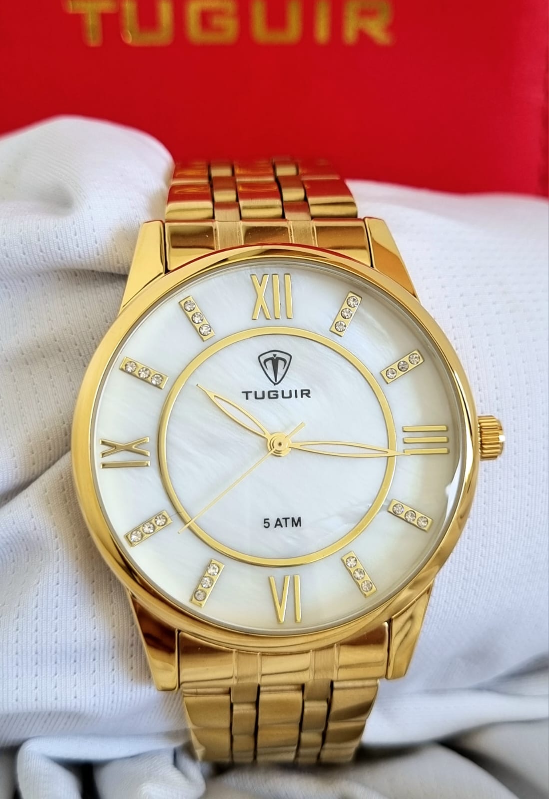 Descrição: relógio feminino Tuguir em aço inox banhado a ouro 18k, 1 ano de garantia apenas no funcionamento do relógio, a garantia não cobre a pulseira.
