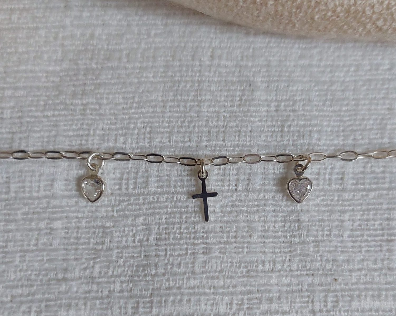 Descrição: tornozeleira com pingente de cruz lisa e ponto de luz no formato de coração.